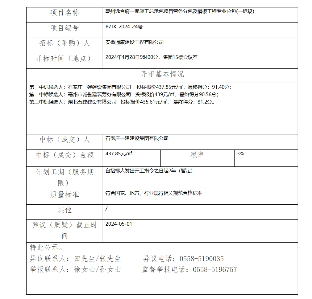 亳州逸合府一期施工總承包項(xiàng)目勞務(wù)分包及模板工程專業(yè)分包(一標(biāo)段)中標(biāo)(成交)結(jié)果公示
