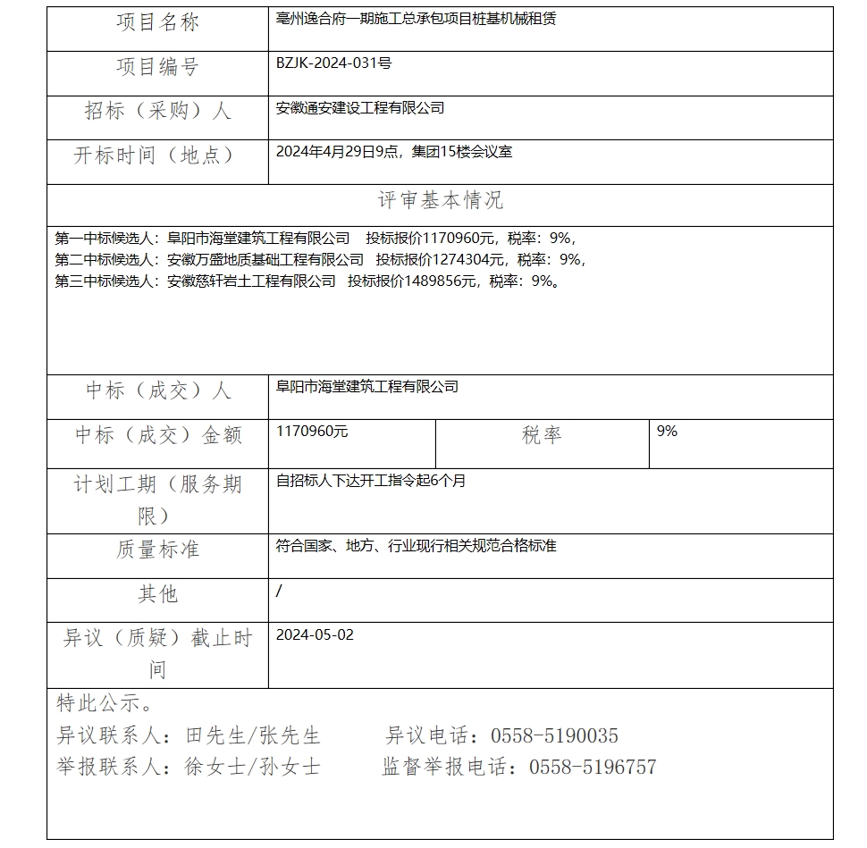 亳州逸合府一期施工總承包項(xiàng)目樁基機(jī)械租賃中標(biāo)(成交)結(jié)果公示