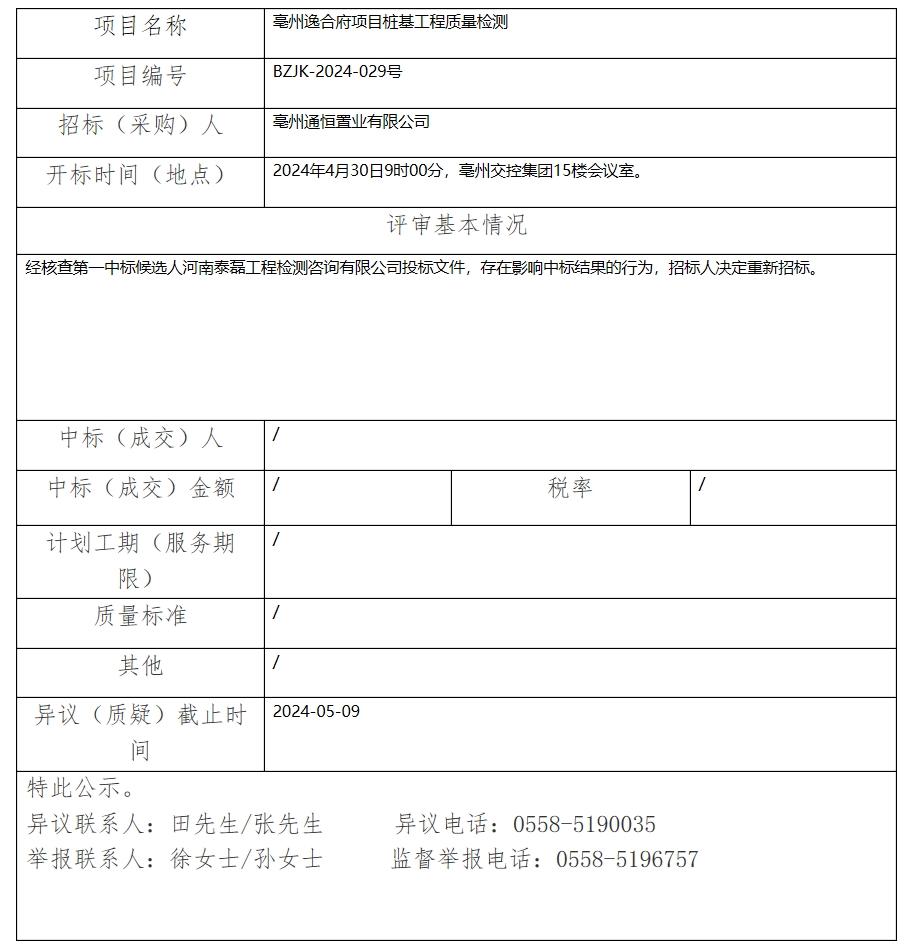 亳州逸合府項(xiàng)目樁基工程質(zhì)量檢測(cè)中標(biāo)(成交)結(jié)果公示