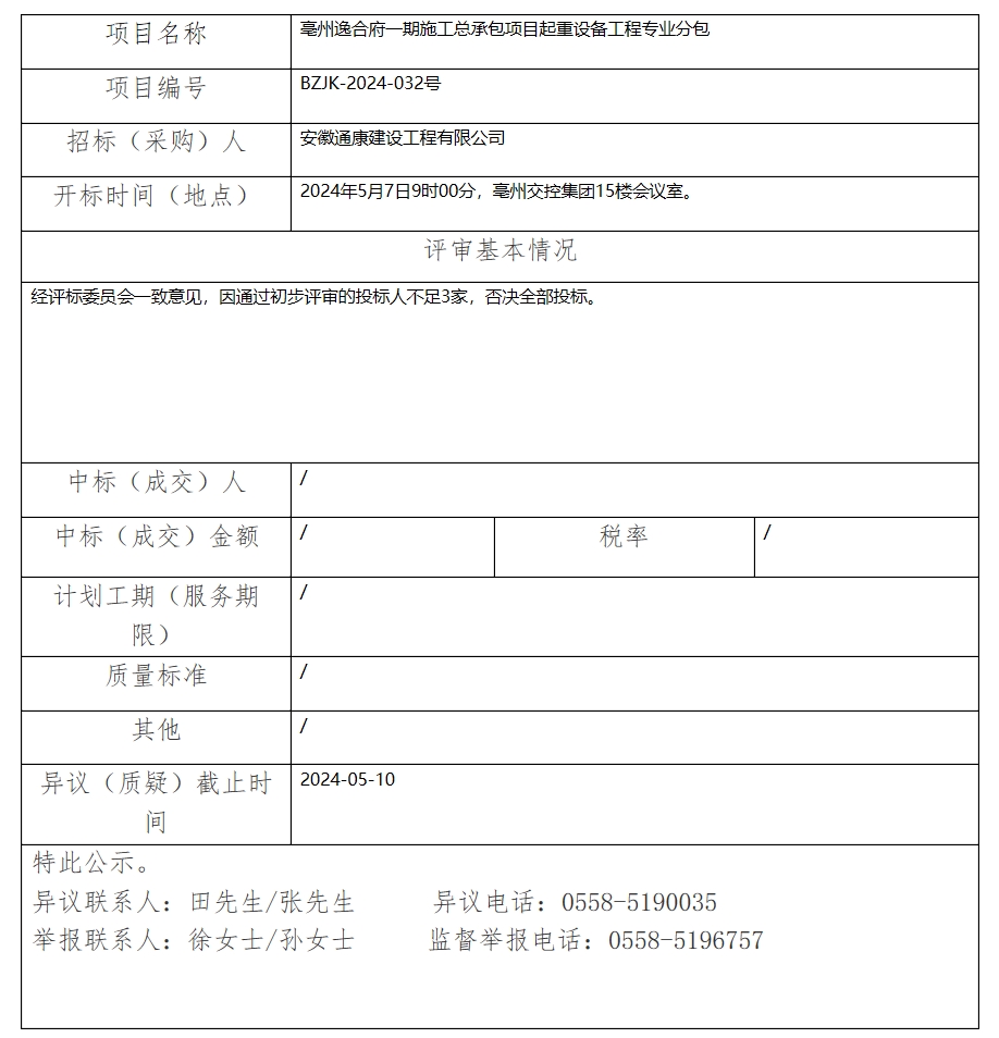 亳州逸合府一期施工總承包項(xiàng)目起重設(shè)備工程專業(yè)分包中標(biāo)(成交)結(jié)果公示