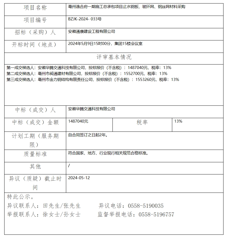 亳州逸合府一期施工總承包項(xiàng)目止水鋼板、玻纖網(wǎng)、鋼絲網(wǎng)材料采購(gòu)中標(biāo)(成交)結(jié)果公示
