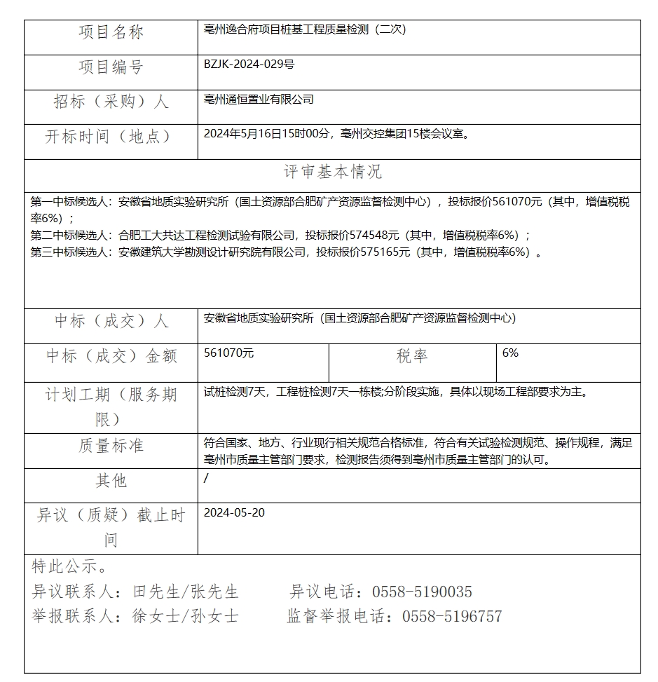 亳州逸合府項(xiàng)目樁基工程質(zhì)量檢測(cè)(二次)中標(biāo)(成交)結(jié)果公示