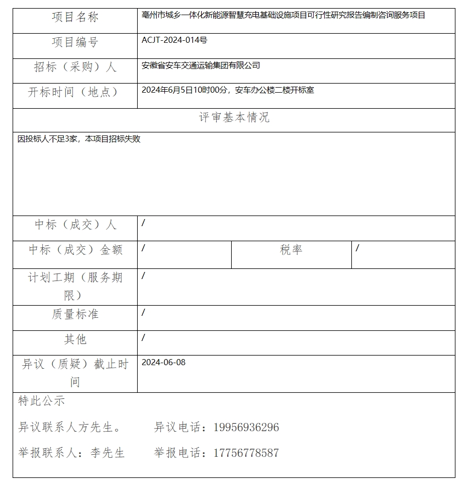 亳州市城鄉(xiāng)一體化新能源智慧充電基礎(chǔ)設(shè)施項(xiàng)目可行性研究報(bào)告編制咨詢服務(wù)項(xiàng)目中標(biāo)(成交)結(jié)果公示