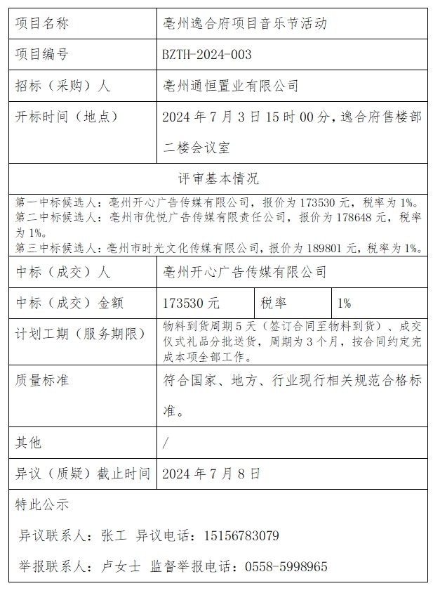 亳州逸合府項目開盤活動中標結(jié)果公示