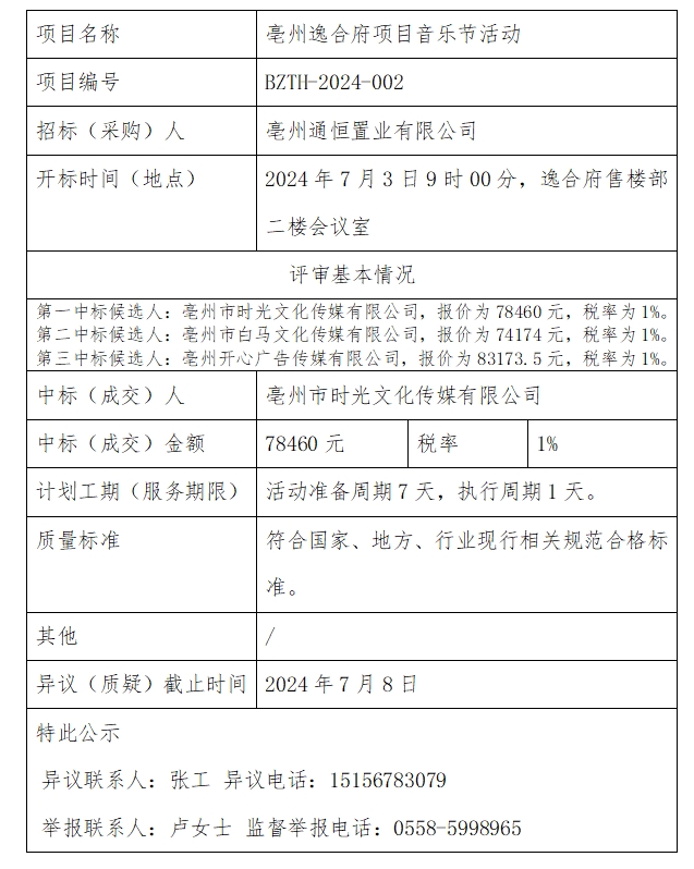 亳州逸合府項(xiàng)目音樂節(jié)活動(dòng)中標(biāo)結(jié)果公示