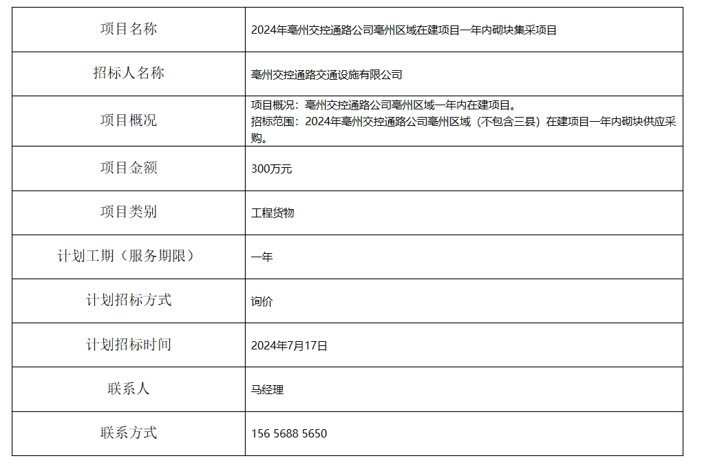2024年亳州交控通路公司亳州區(qū)域在建項目一年內(nèi)砌塊集采項目招標(biāo)計劃