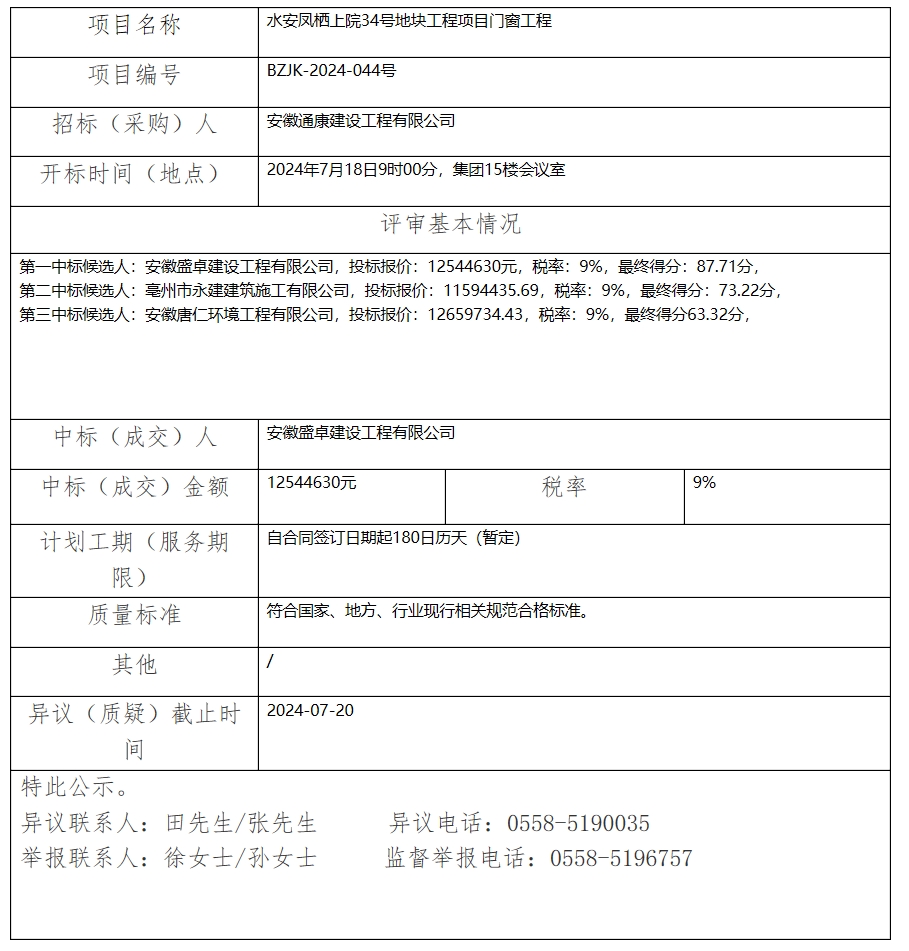 水安鳳棲上院34號地塊工程項目門窗工程中標(biāo)(成交)結(jié)果公示