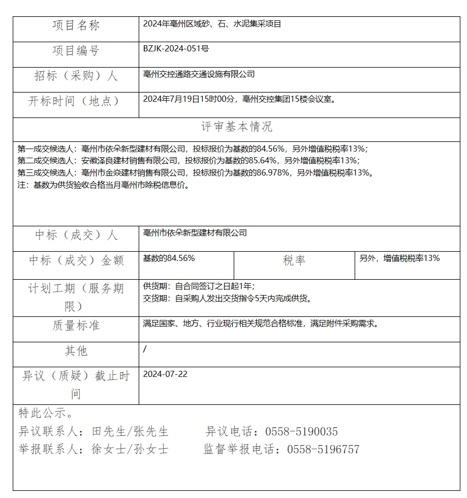 2024年亳州區(qū)域砂、石、水泥集采項目中標(成交)結(jié)果公示