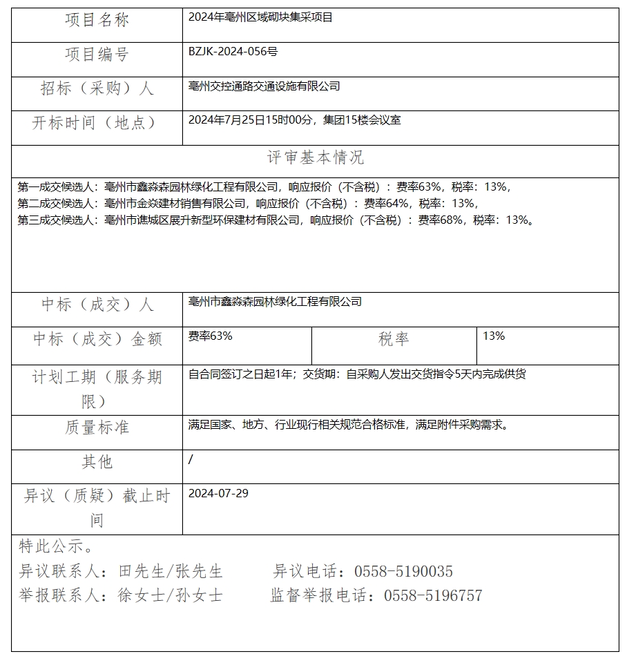 2024年亳州區(qū)域砌塊集采項目中標(biāo)(成交)結(jié)果公示
