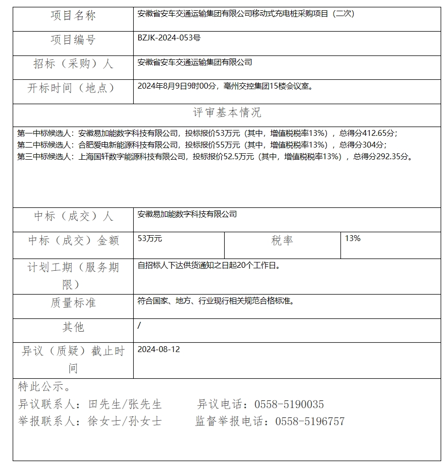 安徽省安車(chē)交通運(yùn)輸集團(tuán)有限公司移動(dòng)式充電樁采購(gòu)項(xiàng)目(二次)中標(biāo)(成交)結(jié)果公示