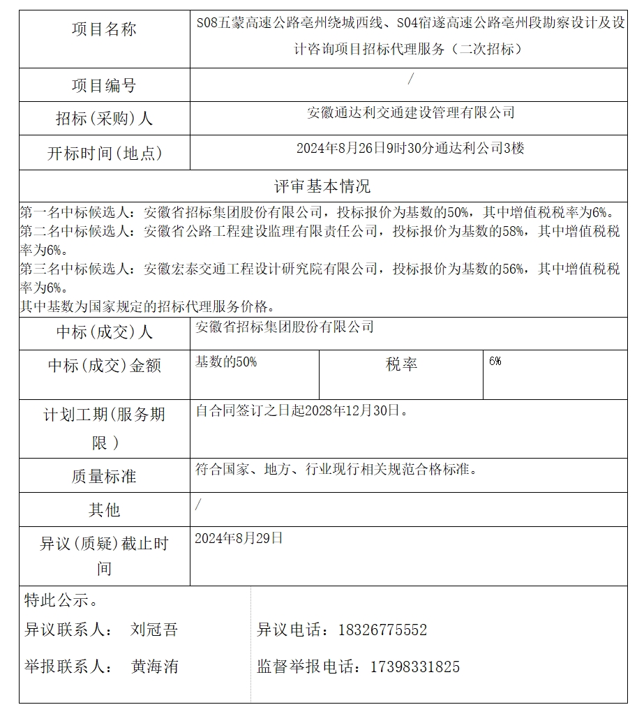 S08五蒙高速公路亳州繞城西線、S04宿遂高速公路亳州段勘察設(shè)計(jì)及設(shè)計(jì)咨詢項(xiàng)目招標(biāo)代理服務(wù)(二次招標(biāo))中標(biāo)(成交)結(jié)果公示