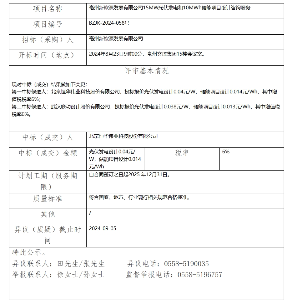 亳州新能源發(fā)展有限公司15MW光伏發(fā)電和10MWh儲能項(xiàng)目設(shè)計(jì)咨詢服務(wù)中標(biāo)結(jié)果變更公示