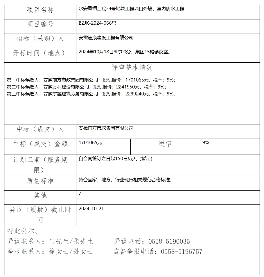 水安鳳棲上院34號(hào)地塊工程項(xiàng)目外墻、室內(nèi)防水工程中標(biāo)(成交)結(jié)果公示