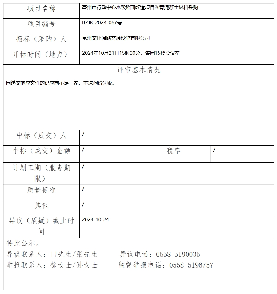 亳州市行政中心水毀路面改造項目瀝青混凝土材料采購中標(成交)結(jié)果公示