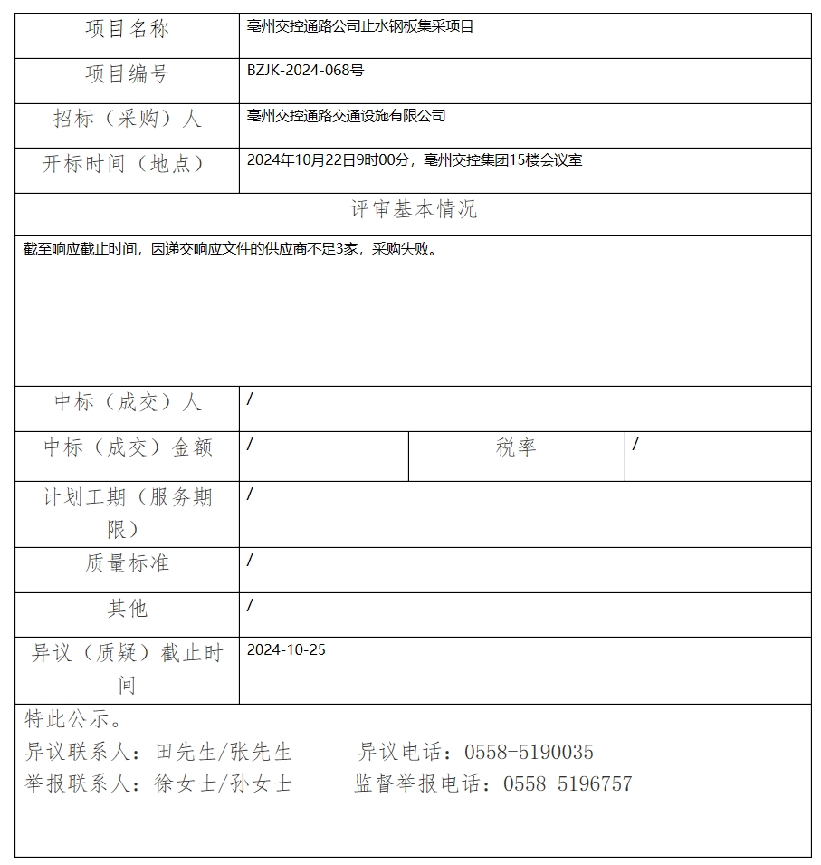 亳州交控通路公司止水鋼板集采項目中標(biāo)(成交)結(jié)果公示