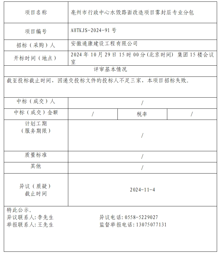 亳州市行政中心水毀路面改造項(xiàng)目霧封層專業(yè)分包中標(biāo)(成交)結(jié)果公示