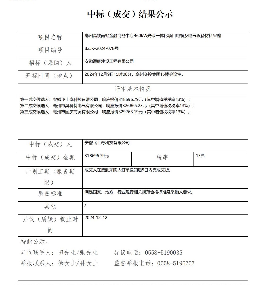 亳州高鐵南站金融商務(wù)中心460kW光儲一體化項(xiàng)目電纜及電氣設(shè)備材料采購中標(biāo)(成交)結(jié)果公示