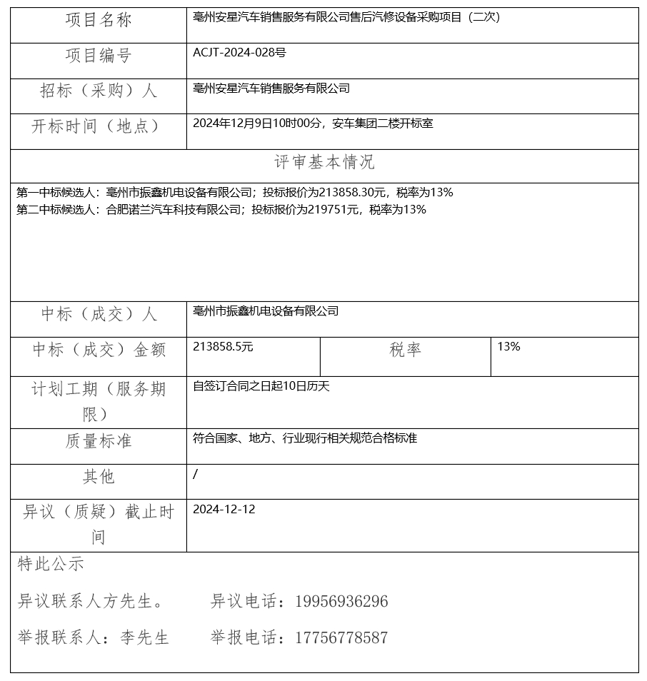 亳州安星汽車(chē)銷(xiāo)售服務(wù)有限公司售后汽修設(shè)備采購(gòu)項(xiàng)目(二次)中標(biāo)(成交)結(jié)果公示