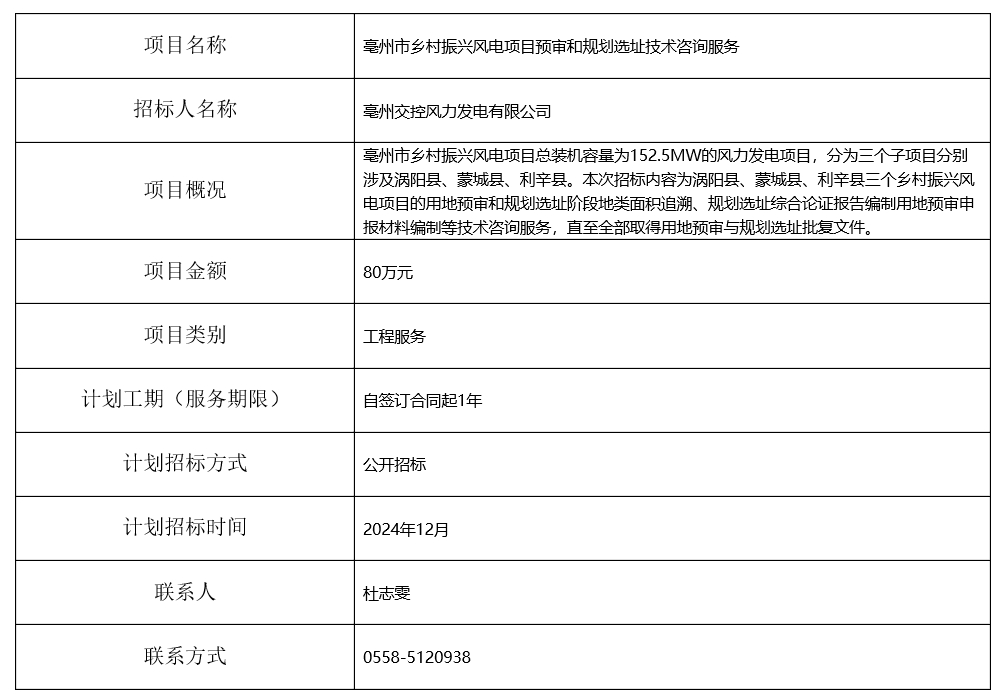 亳州市鄉(xiāng)村振興風(fēng)電項(xiàng)目預(yù)審和規(guī)劃選址技術(shù)咨詢服務(wù)招標(biāo)計(jì)劃