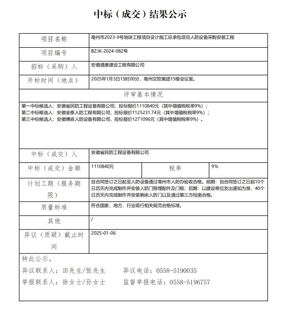 亳州市2023-9號(hào)地塊工程項(xiàng)目設(shè)計(jì)施工總承包項(xiàng)目人防設(shè)備采購(gòu)安裝工程中標(biāo)(成交)結(jié)果公示