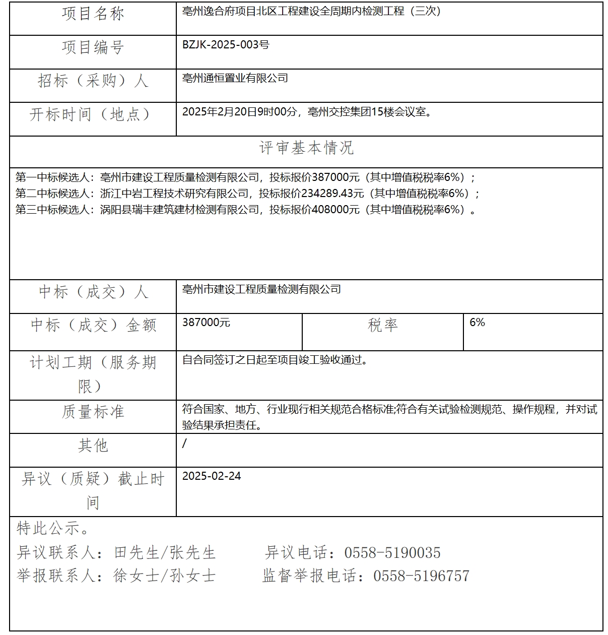 亳州逸合府項(xiàng)目北區(qū)工程建設(shè)全周期內(nèi)檢測工程(三次)中標(biāo)(成交)結(jié)果公示