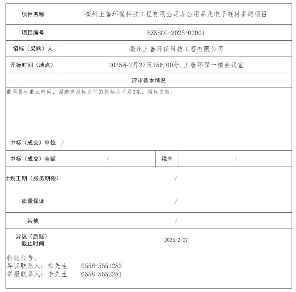 亳州上善環(huán)??萍脊こ逃邢薰巨k公用品及電子耗材采購項目中標(biāo)結(jié)果公示
