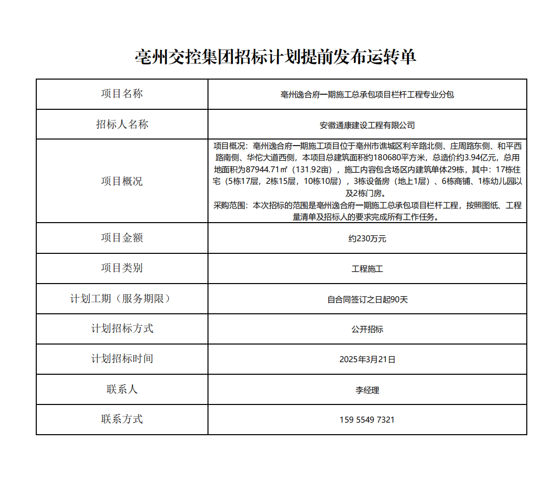 亳州逸合府一期施工總承包項(xiàng)目欄桿工程專(zhuān)業(yè)分包招標(biāo)計(jì)劃