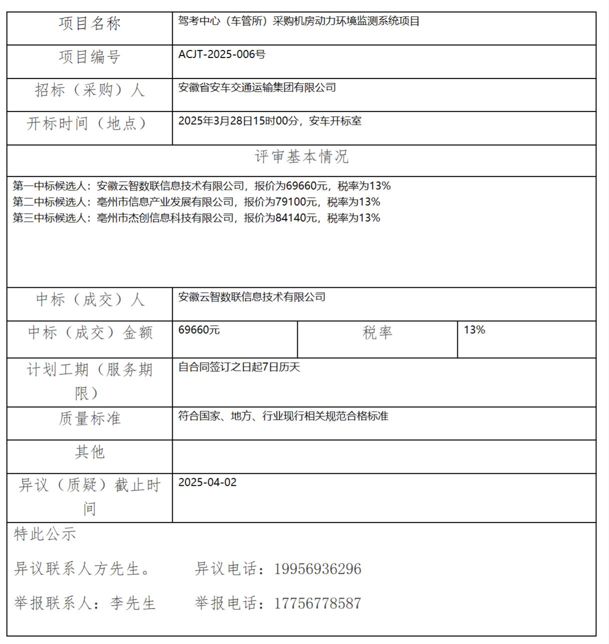 駕考中心(車管所)采購機(jī)房動力環(huán)境監(jiān)測系統(tǒng)項(xiàng)目中標(biāo)(成交)結(jié)果公示