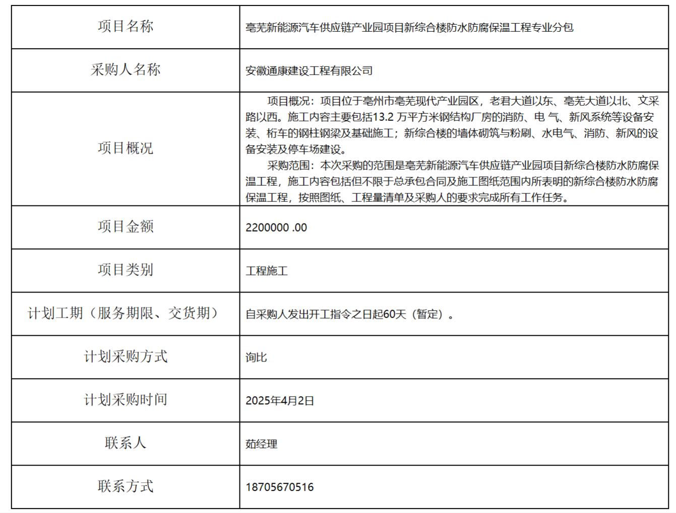 亳蕪新能源汽車供應(yīng)鏈產(chǎn)業(yè)園項(xiàng)目新綜合樓防水防腐保溫工程專業(yè)分包采購計(jì)劃