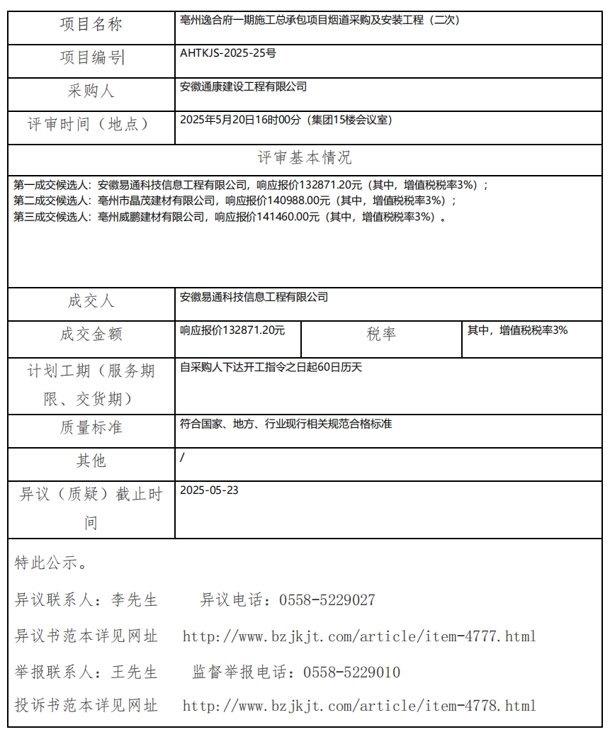 亳州逸合府一期施工總承包項(xiàng)目煙道采購(gòu)及安裝工程(二次)成交結(jié)果公示