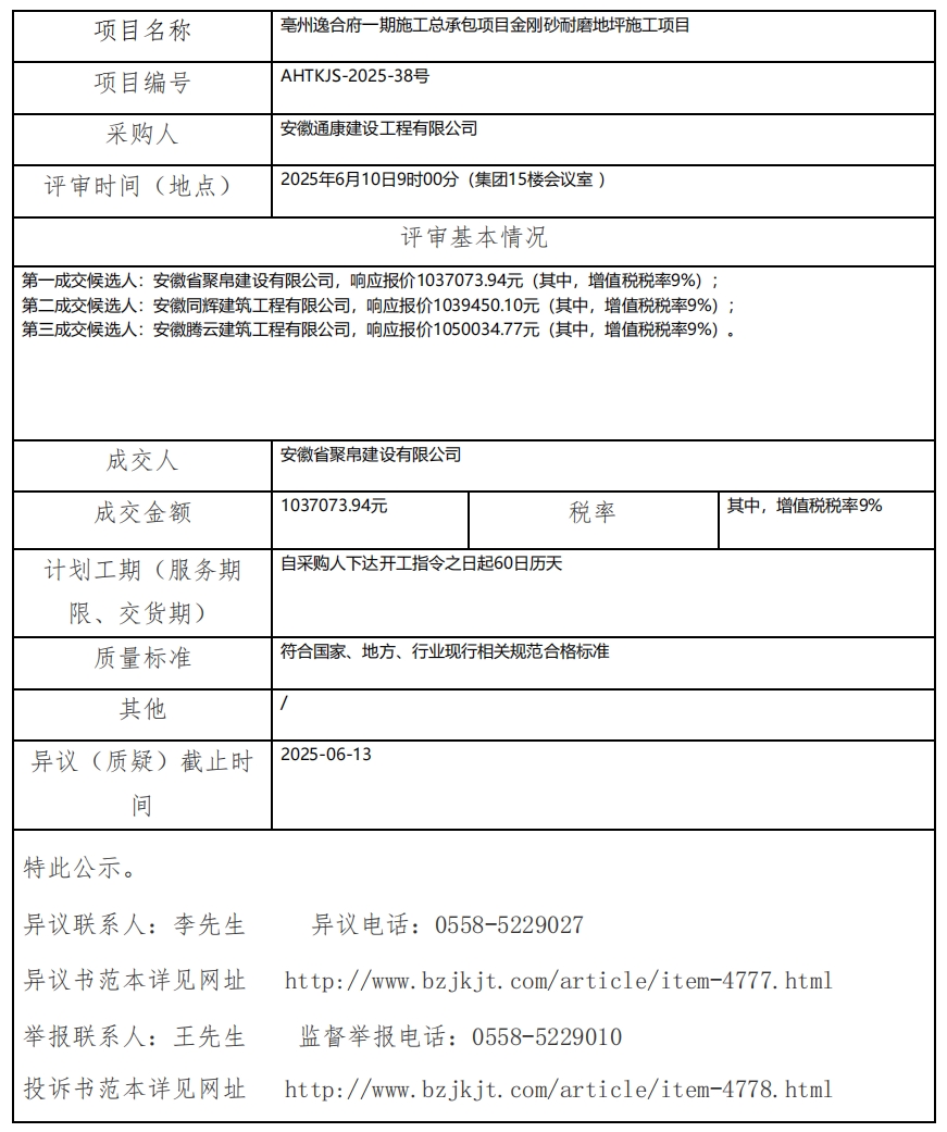 亳州逸合府一期施工總承包項目金剛砂耐磨地坪施工項目成交結(jié)果公示