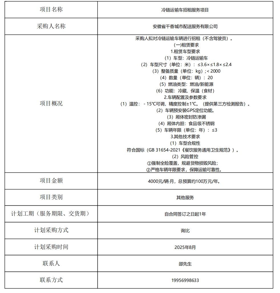 冷鏈運(yùn)輸車(chē)招租服務(wù)項(xiàng)目采購(gòu)計(jì)劃