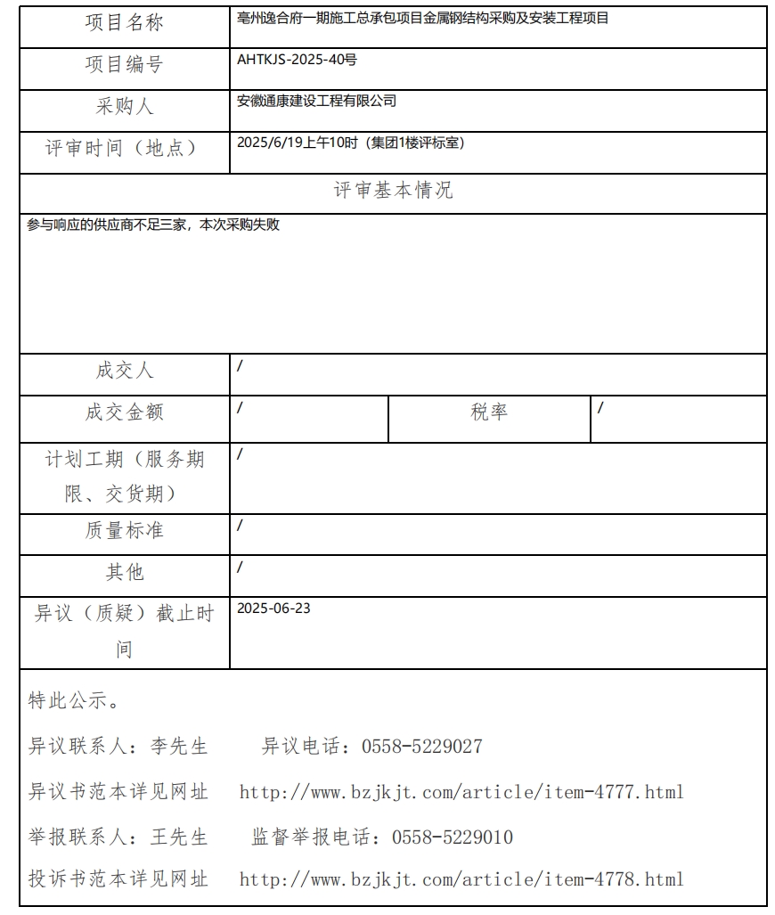 亳州逸合府一期施工總承包項目金屬鋼結(jié)構(gòu)采購及安裝工程項目成交結(jié)果公