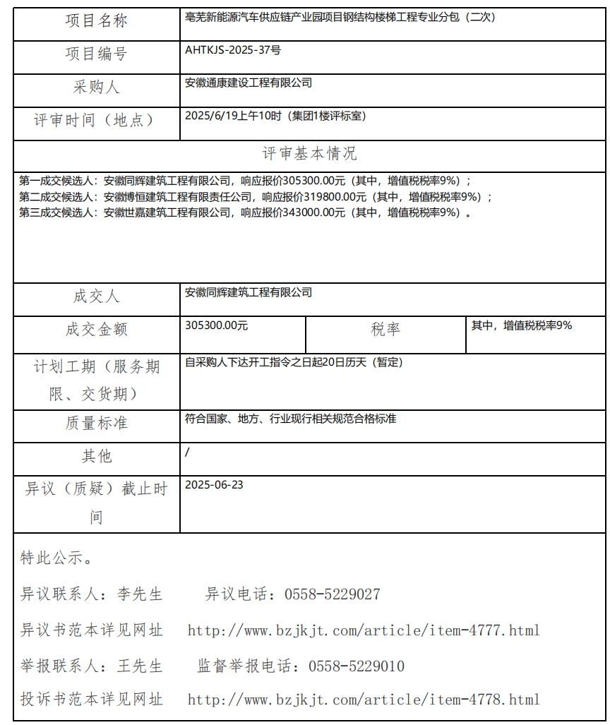 亳蕪新能源汽車供應鏈產(chǎn)業(yè)園項目鋼結(jié)構(gòu)樓梯工程專業(yè)分包(二次)成交結(jié)果公示