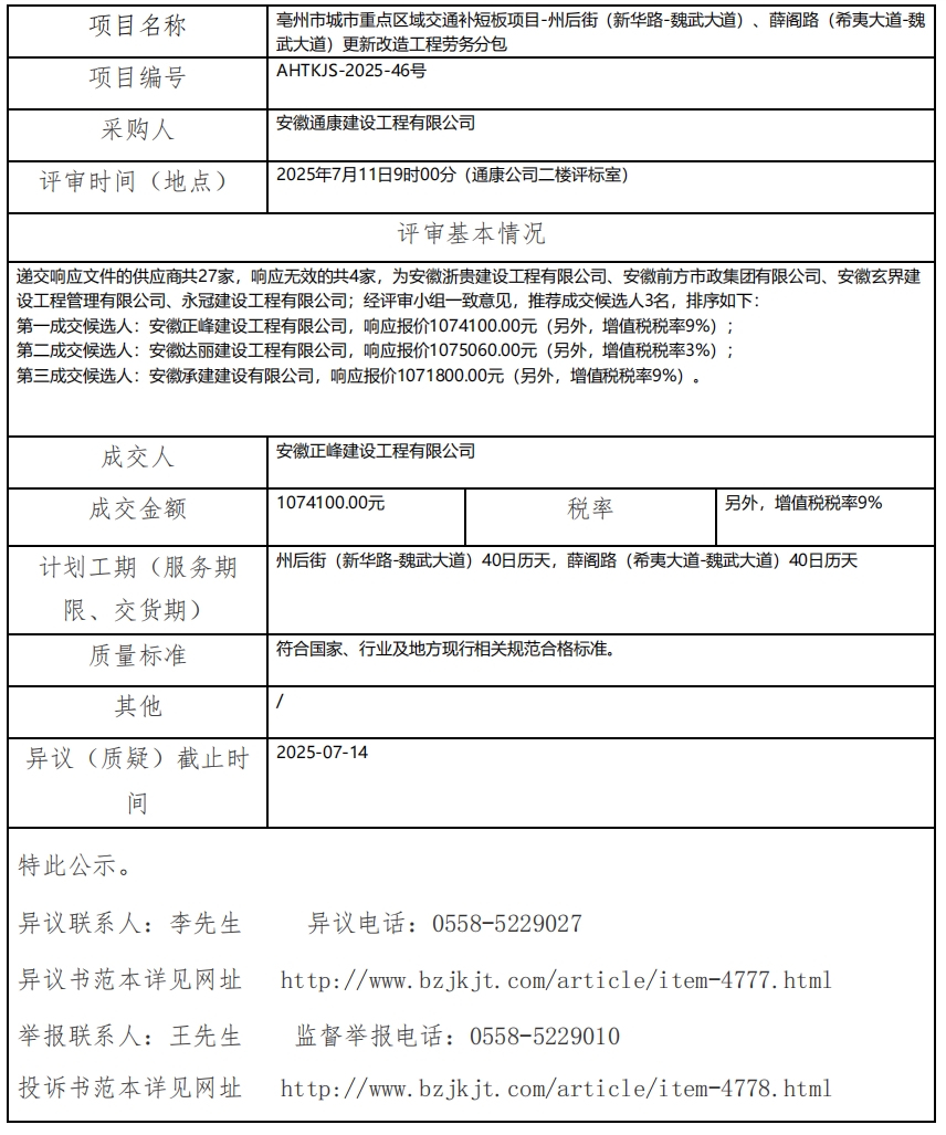亳州市城市重點(diǎn)區(qū)域交通補(bǔ)短板項(xiàng)目-州后街(新華路-魏武大道)、薛閣路(希夷大道-魏 武大道)更新改造工程勞務(wù)分包成交結(jié)果公示