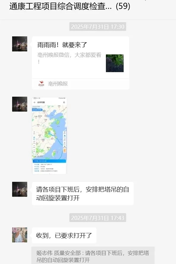 提前部署防汛工作,全面排查施工現(xiàn)場排水系統(tǒng)、臨時設施穩(wěn)固性及應急物資儲備情況,對低洼易澇區(qū)域針對性落實防洪排澇措施,嚴格執(zhí)行24小時領(lǐng)導帶班和專人值班制度,密切跟蹤氣象預警和雨情水情信息,確保信息暢通、響應迅速、防范有效。