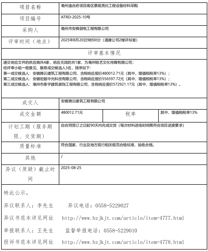 亳州逸合府項目南區(qū)景觀亮化工程設(shè)備材料采購成交結(jié)果公示