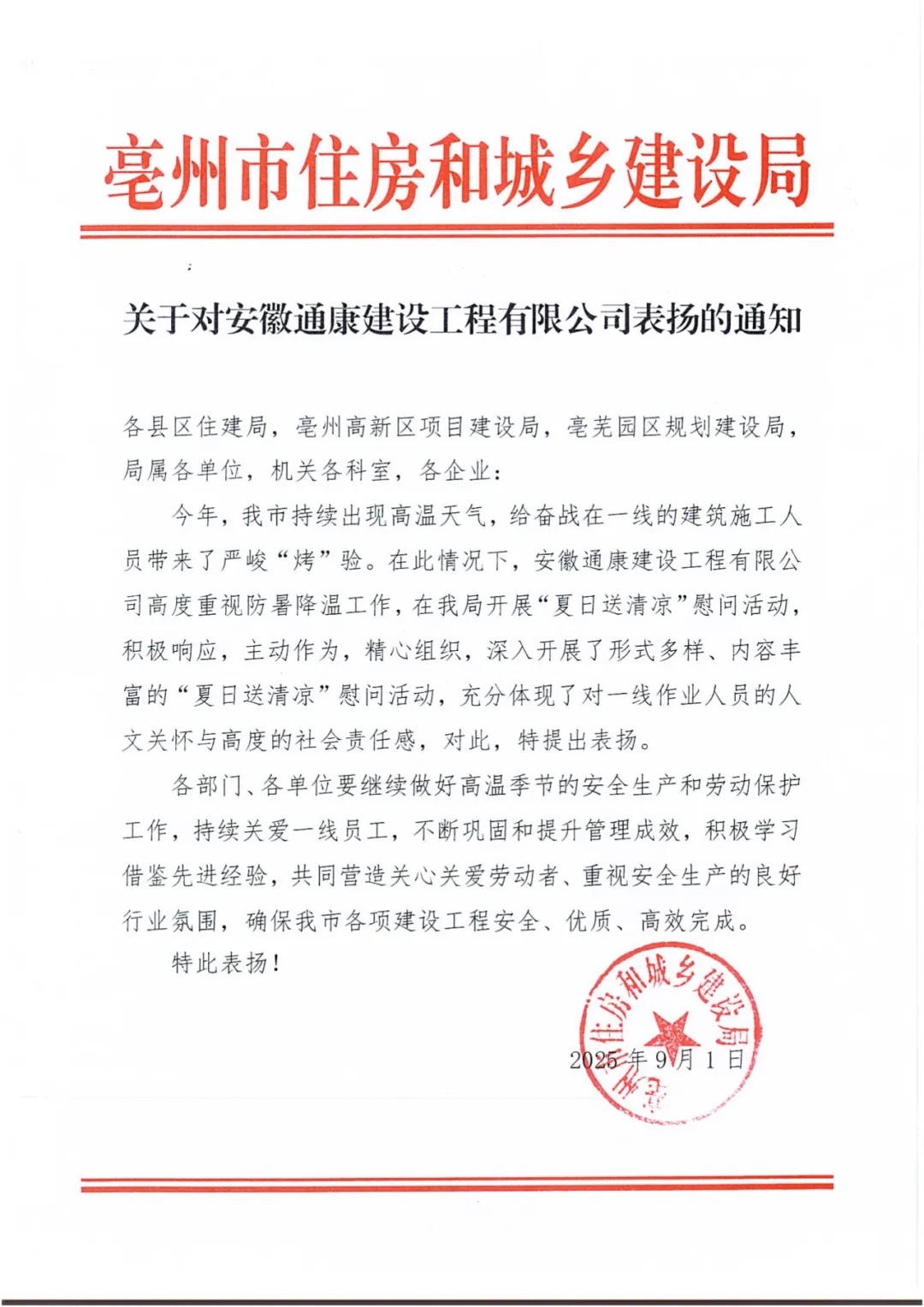 近日,通康公司收到了亳州市住房和城鄉(xiāng)建設(shè)局發(fā)來(lái)的表?yè)P(yáng)文件,文件對(duì)通康公司在防暑降溫、安全生產(chǎn)、保障勞動(dòng)者安全健康等方面表示了充分肯定,為全市建筑行業(yè)樹立了優(yōu)秀典范。