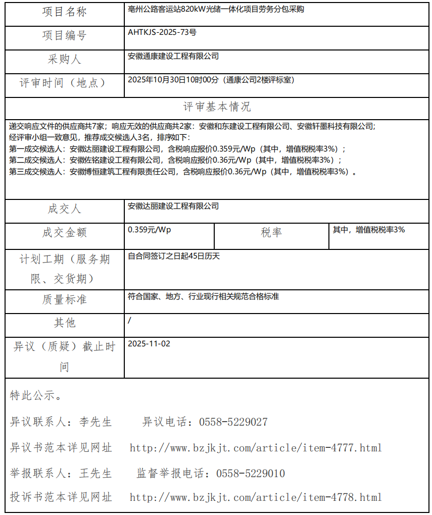 亳州公路客運(yùn)站820kW光儲一體化項目勞務(wù)分包采購成交結(jié)果公示