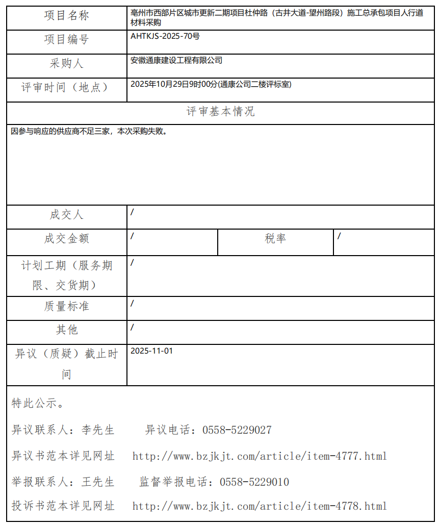 亳州市西部片區(qū)城市更新二期項目杜仲路(古井大道-望州路段)施工總承包項目人行道材料采購成交結(jié)果公示