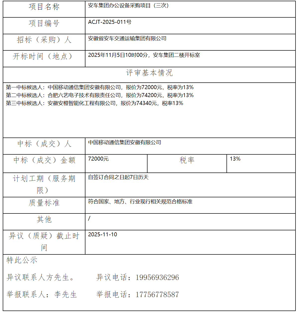 安車集團辦公設(shè)備采購項目(三次) 中標(biāo)(成交)結(jié)果公示
