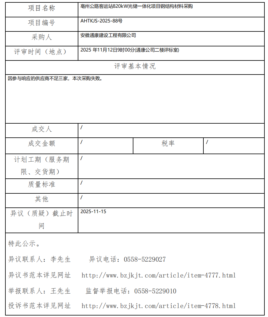 亳州公路客運(yùn)站820kW光儲(chǔ)一體化項(xiàng)目鋼結(jié)構(gòu)材料采購(gòu)成交結(jié)果公示