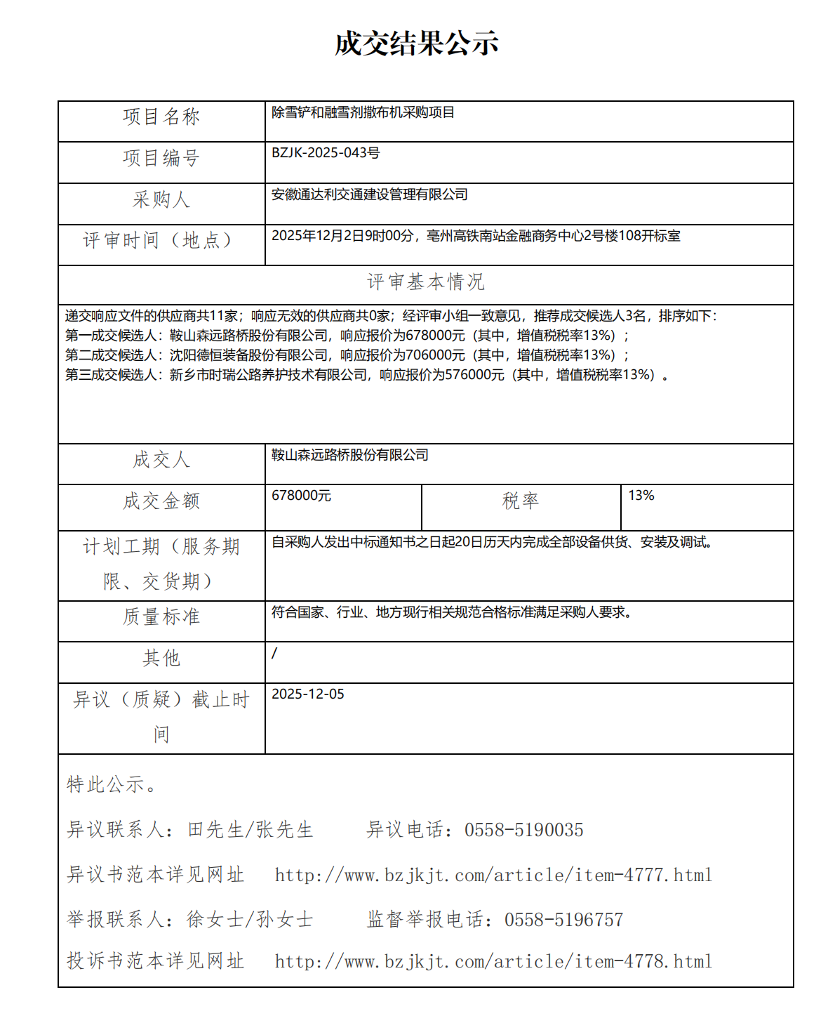 除雪鏟和融雪劑撒布機采購項目成交結(jié)果公示
