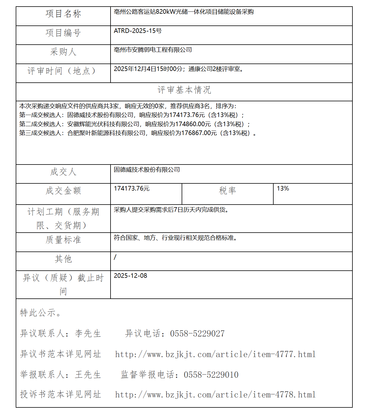 亳州公路客運站820kW光儲一體化項目儲能設(shè)備采購成交結(jié)果公示