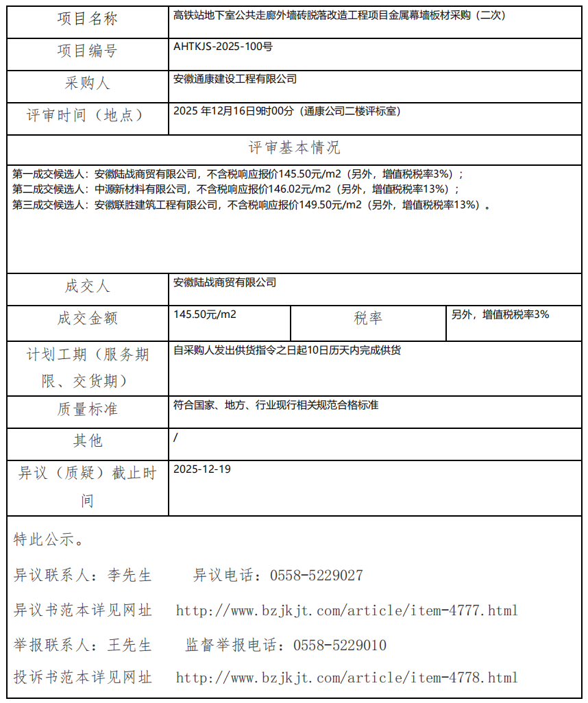 高鐵站地下室公共走廊外墻磚脫落改造工程項目金屬幕墻板材采購(二次)成交結果公示