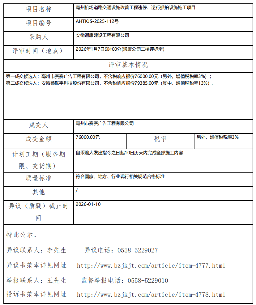 亳州機(jī)場道路交通設(shè)施改善工程違停、逆行抓拍設(shè)施施工項目成交結(jié)果公示