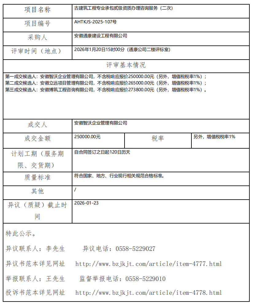 古建筑工程專業(yè)承包貳級(jí)資質(zhì)辦理咨詢服務(wù)(二次)成交結(jié)果公示