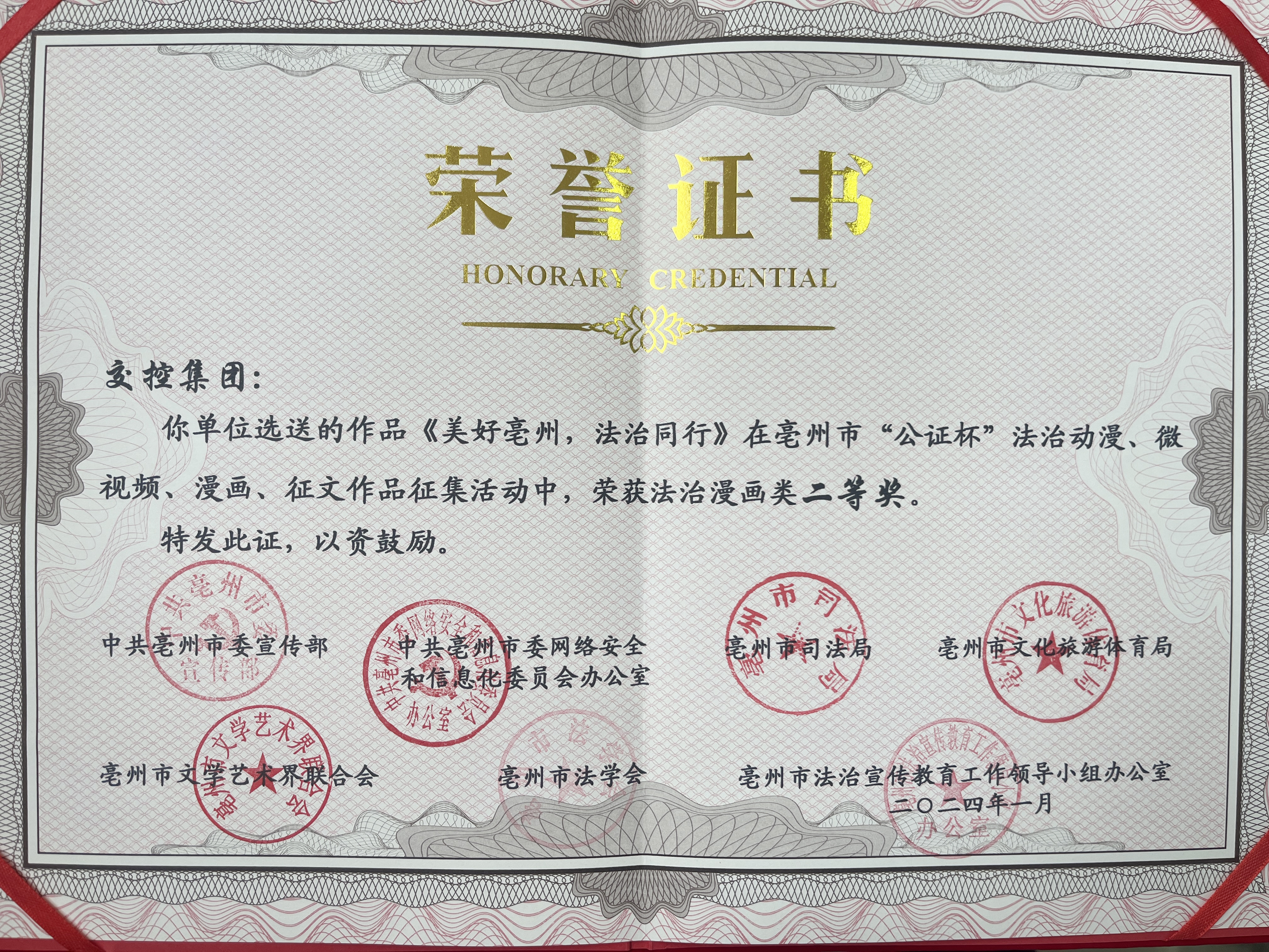 近日,亳州市委宣傳部、市委網(wǎng)信辦、市司法局、市文旅體局、市文聯(lián)、市法學(xué)會、市法宣辦聯(lián)合發(fā)文通報了亳州市“公正杯”法治動漫、微視頻、漫畫、征文作品征集活動獲獎情況,交控集團(tuán)參賽作品《美好亳州法治同行》漫畫在全市245部篇參賽作品中脫穎而出,榮獲漫...